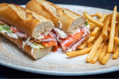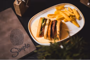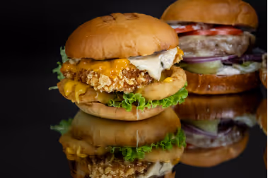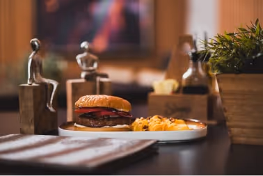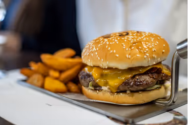Burger meso, zemička, mozzarella, cheddar, garlic mayo dressing, iceberg, crveni luk, paradajz, pomfrit