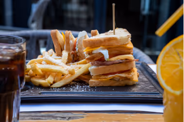 Tost hleb, jaje, panceta, iceberg, pileći file, paradajz, cheddar, pomfrit