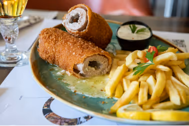 Cepkana svinjska butkica, panko prezla, dressing, pomfrit