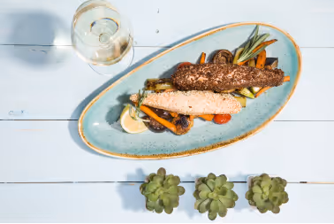 Fileti pastrmke, baby spanać, rucola, med, orah