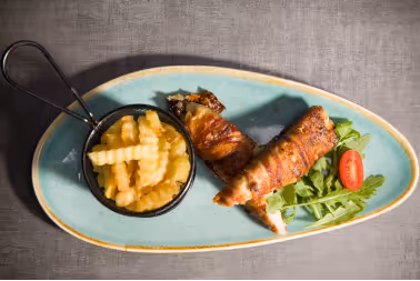 Piletina, sos od četiri sira, rucola, kroketi krompira