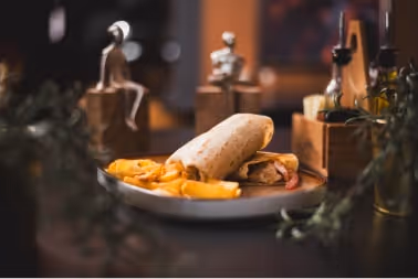 Domaća tortilja, grilovana piletina, neutralna pavlaka, paradajz, zelenasalata, pomfrit