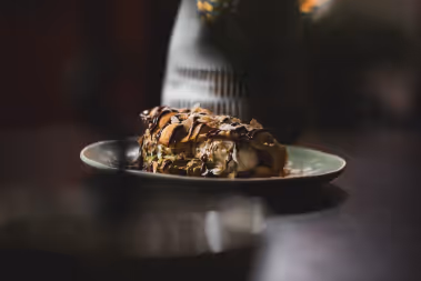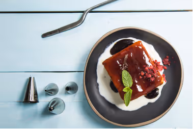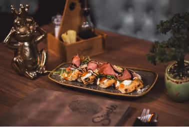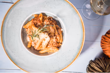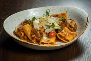 Juneći repovi, krompir pire, luk, šargarepa, mozzarella, bechamel sos, hleb štapići