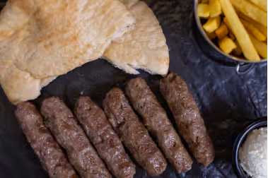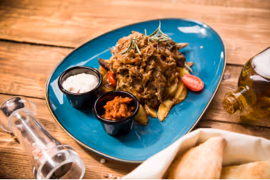 Svinjetina/piletina, kajmak, dressing, pomfrit