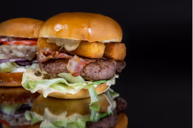 Junetina 100%, zemička, cheddar, jaje, paradajz, hrskavi luk, dressing, pomfrit