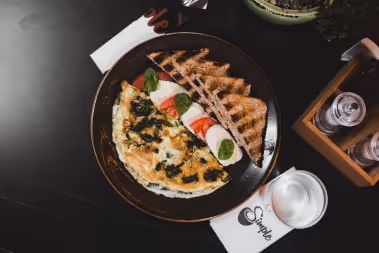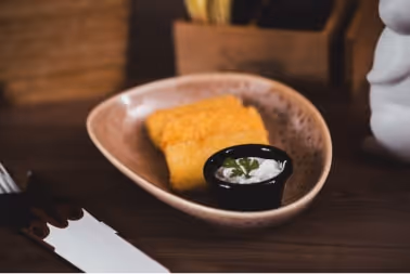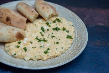 Jaja, bukovača, feta, mladi luk, hleb štapići