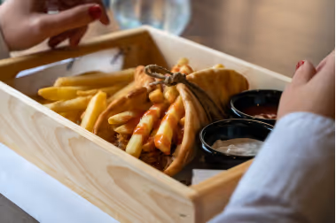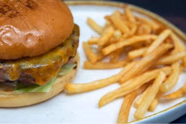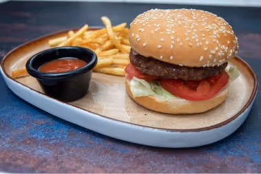Junetina 100%, zemička, cheddar, kečap, senf, kiseli krastavac, pomfrit