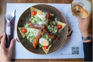 Zelena salata, iceberg, panirani pileći file, nachos, jaja, garlic mayo dressing, cherry, parmezan