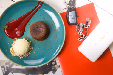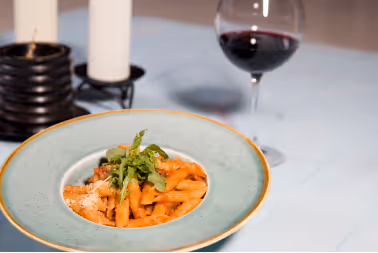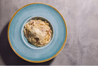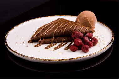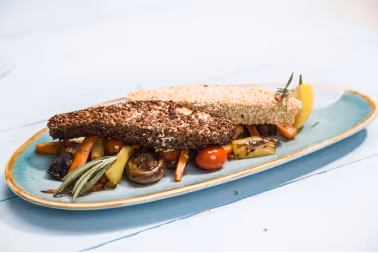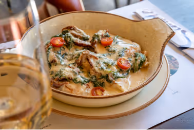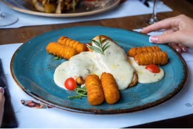 Pileći file, sos od četiri vrste sira, rucola, kroketi krompira