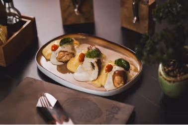 Jaja, mortadela, svinjska pršuta, kulen, kobasica, ajvar, kajmak, kiseli krastavac, beli sir, somun, dressing