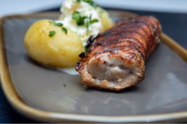 Pileći file, svinjska pršuta, gorgonzola, pavlaka, pire krompir