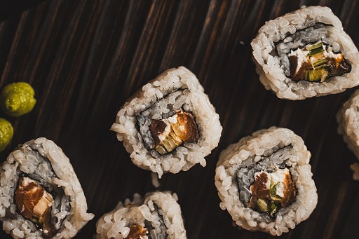 Sushi pirinač, škampi u tempuri, krastavac, paprika, chipotle, susam