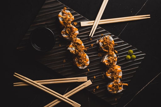 Sushi pirinač, škampi u tempuri, avokado, philadelphia sir, japanski majonez, hrskavi luk