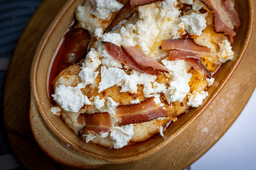 Domaće belo kukurzno brašno, beli sir, pančeta, kiselo mleko, tucana paprika